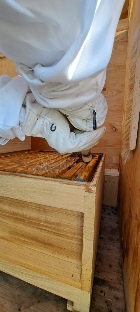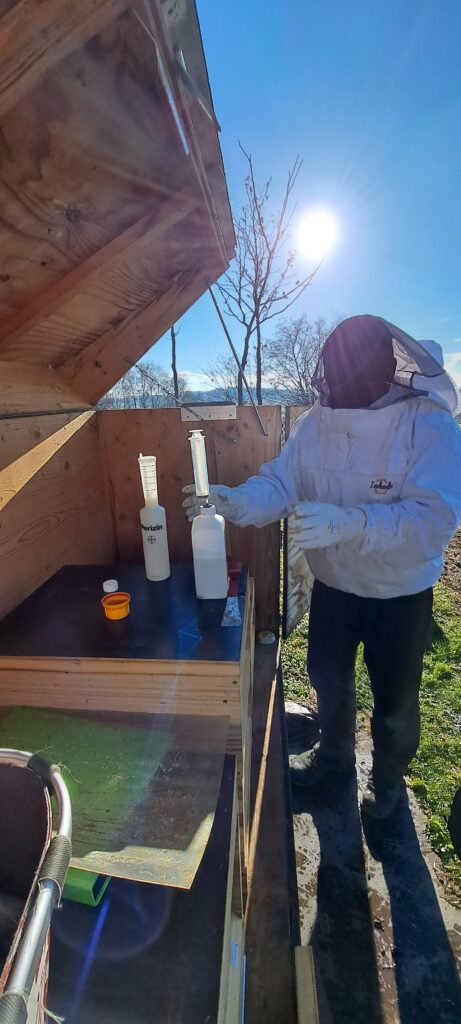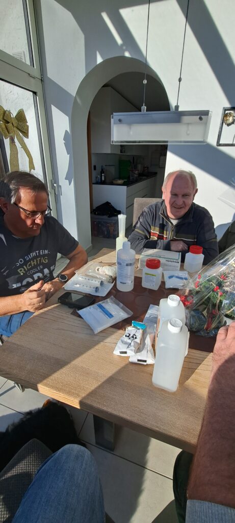 Vor Weihnachten trafen sich noch einmal die Jungimker mit ihren Paten Klaus Oberbuchner und Peter Reiß zur Varroabehandlung der Völker in Oberscherm an den Übungsbienenständen. Bei einer ersten theoretischen EInführung wurde auf das Mischen der Oxalsäure, die verschiedenen Methoden und das Zubehör eingegangen. Und dann gings los mit der Praxis. Schnell muss, es gehen, damit die Bienen nicht auskühlen, und so war schon ein wenig Aufregung mit im Spiel beim ersten Beträufeln mit der Oxalsäure. Schließlich waren alle vier Völker behandelt und wieder gut verschlossen, so dass erst einmal der Weihnachtsfrieden einkehren kann.